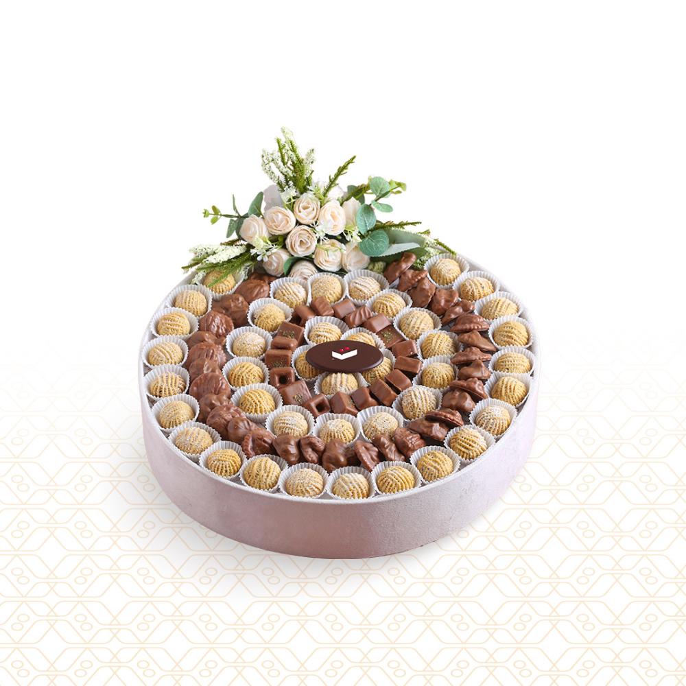صينية مزينة بالورد معمول وشوكولاته : معمول 600 غرام ، شوكولاته 600 غرام