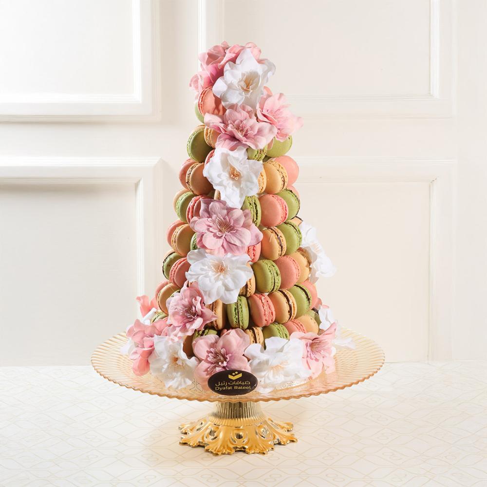هرم ماكارون بحشوات الفراوله والكراميل والفستق  - متجر ضيافات رتيل