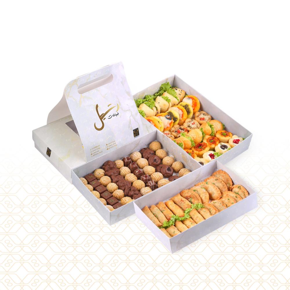 بكج حلو وبكج مالح مكون من بوكس المعمول و الشوكليت 56 قطعة و بوكس معجنات منوعة المكون من 4 قطع كب جبن و 4 قطع كب لحم و 4 قطع كب شاورما دجاج و 5 قطع برجر ميني و 7قطع بيتزا وزعتر و 6 قطع سندوتشات منوعة