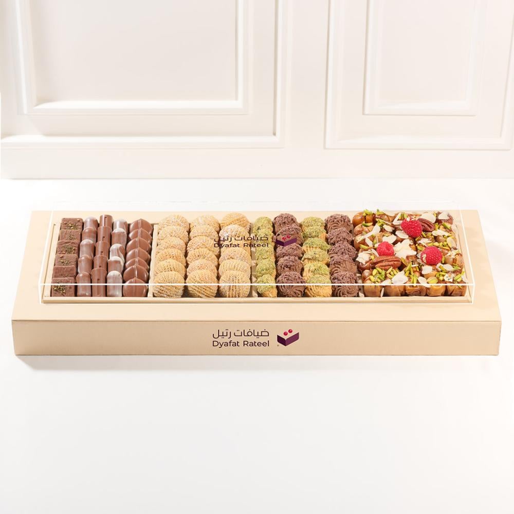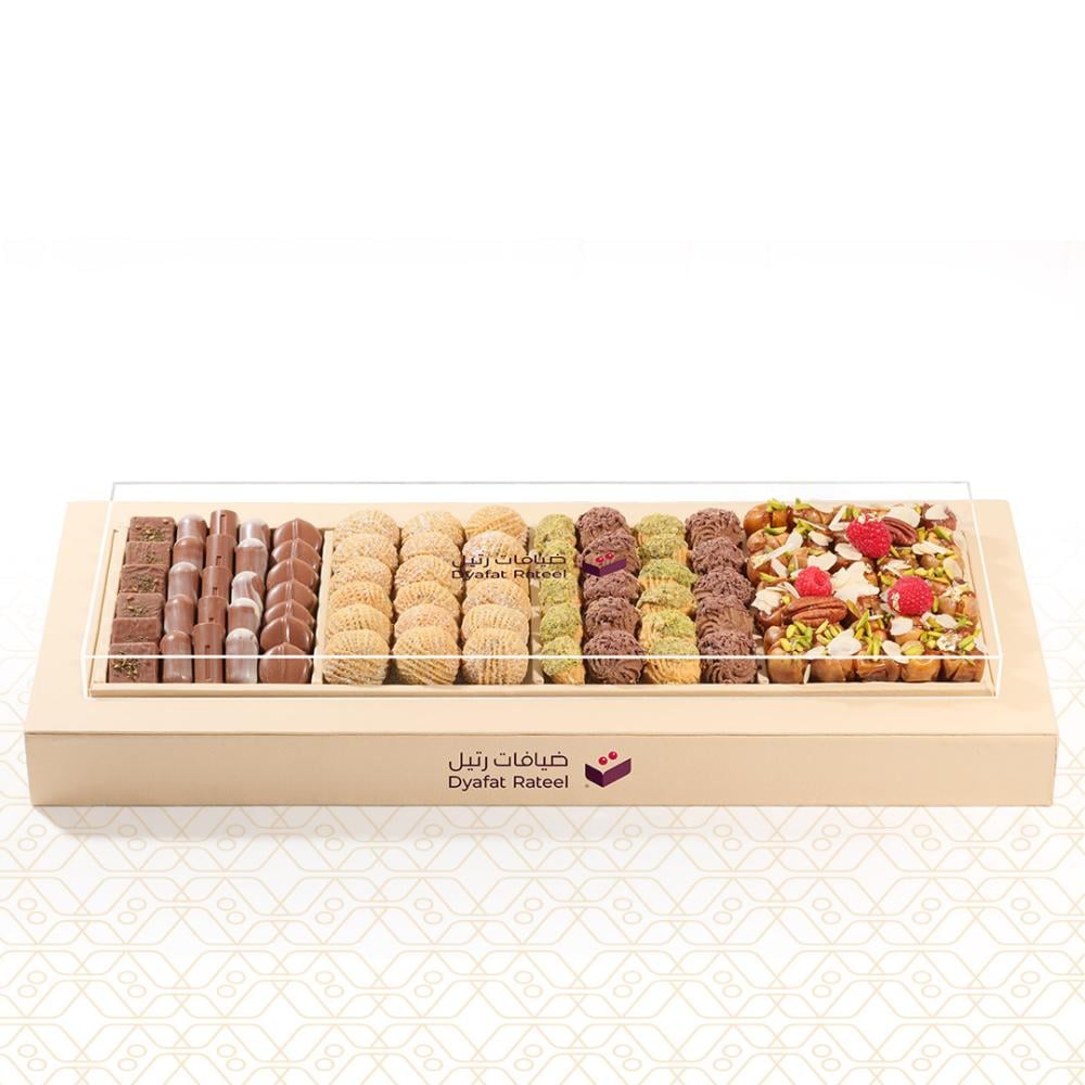 - المحتويات: معمول (320 جم) + تمر محشي (390 جم) + شوكولاتة (290 جم) + بيتيفور (220 جم).