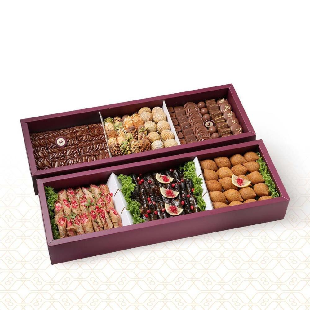 التشكيلات التي تجمع بين المعمول، الشوكولاتة، والميني حلويات.